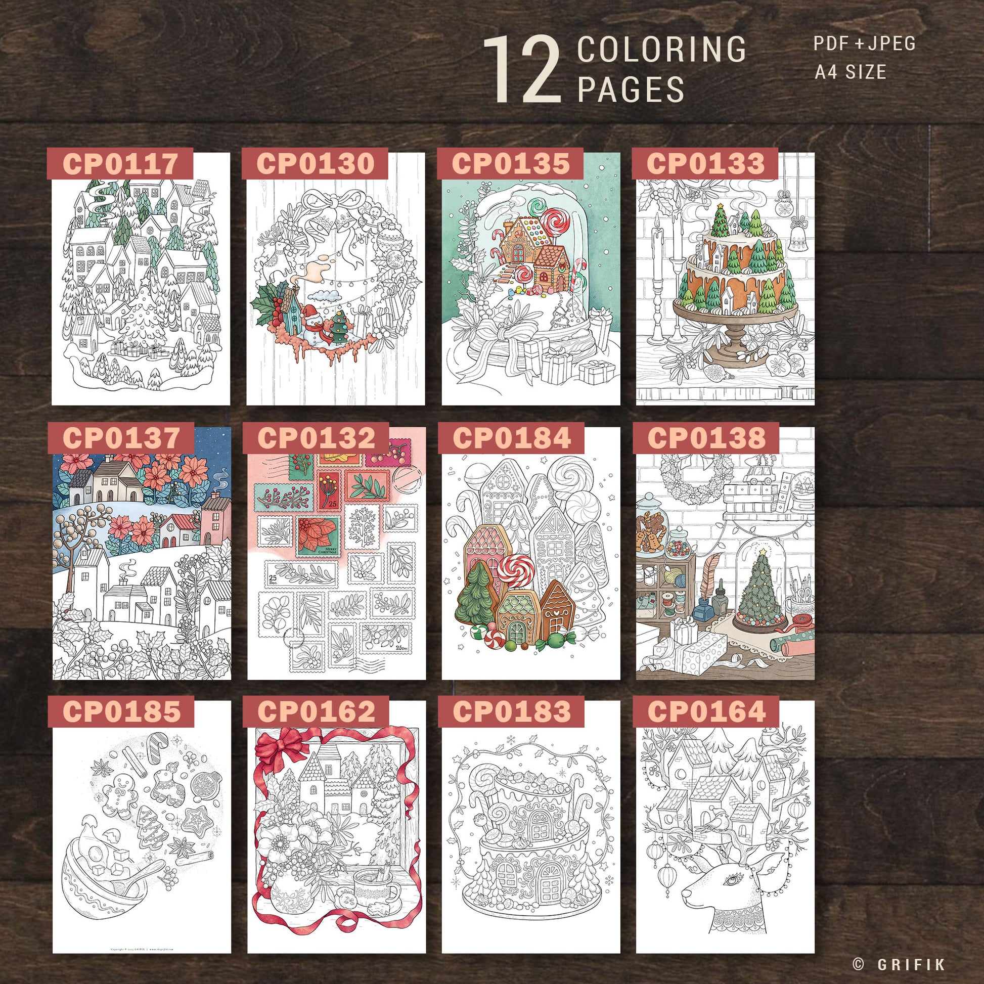 This digital collection brings you 12 hand-drawn pages filled with Christmas cheer—gingerbread houses, beautiful cakes, cute Christmas wreaths, snowy towns and more. Each design invites you to unwind and get creative while embracing the festive spirit of the season.